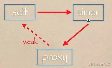 引入一个对象proxy,proxy弱引用 self,然后 proxy 传入NSTimer。即self 强引用NSTimer,NSTimer强引用 proxy,proxy 弱引用 self,这样通过弱引用来解决了相互引用,此时不会形成环。