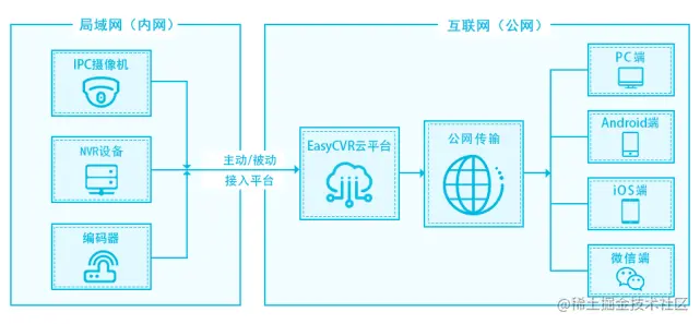 智能化水资源检测系统主要包括四大模块:监控设备、水资源检测设备、EasyCVR视频结构化安防云服务平台和客户端。