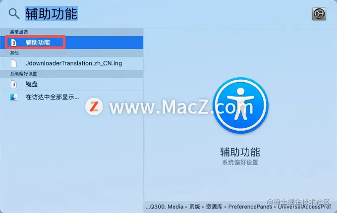 或者你也可以按下键盘上的Command + 空白键(有的人可能是Control + 空白键)打开搜索工具Spotlight,直接搜索「辅助功能」。