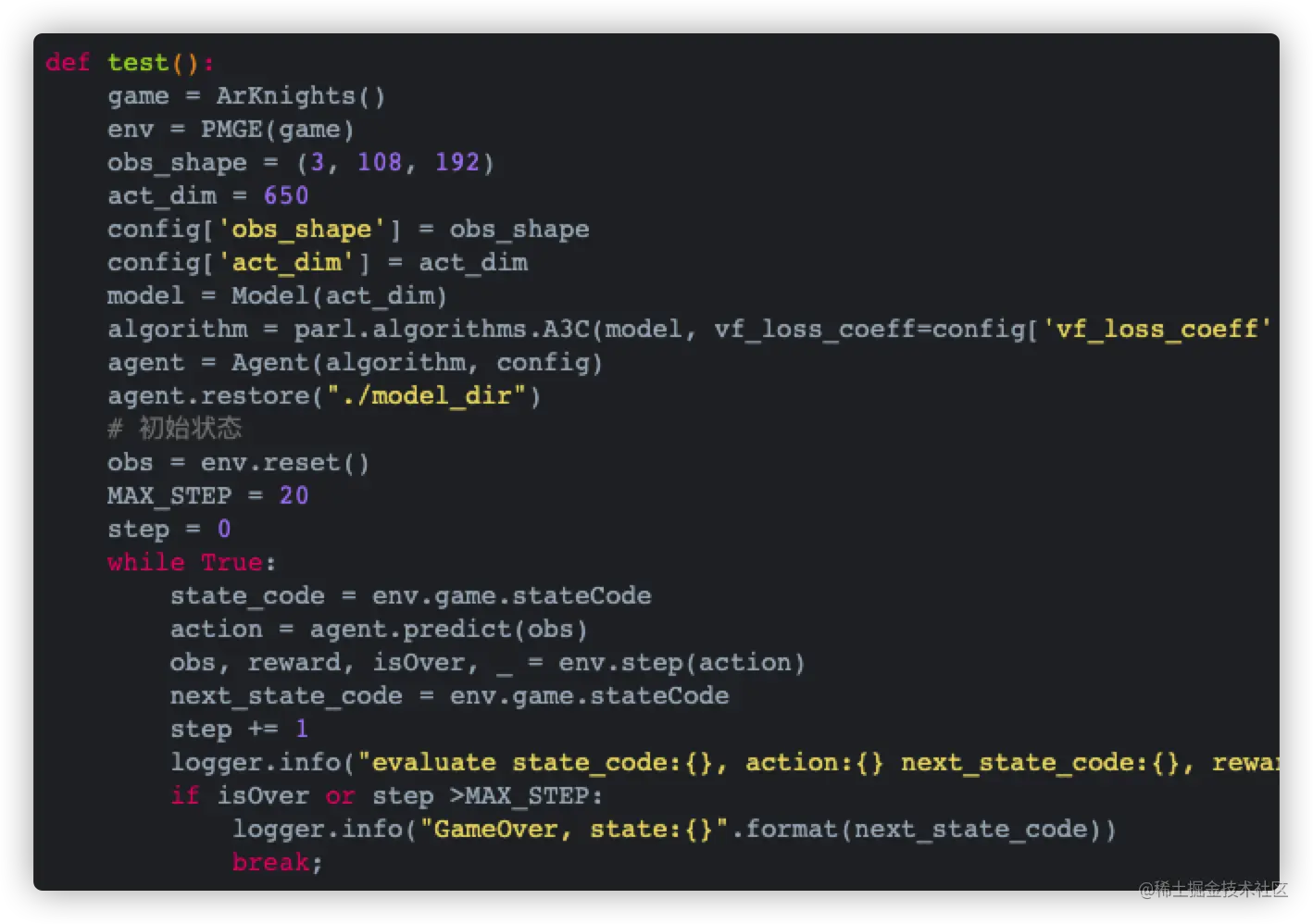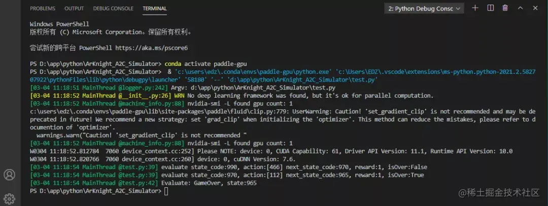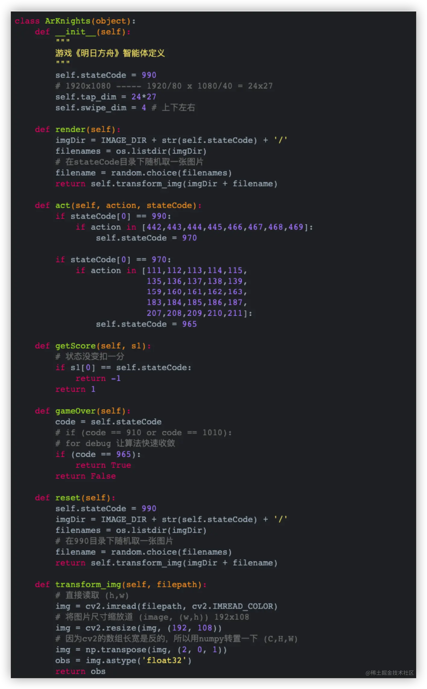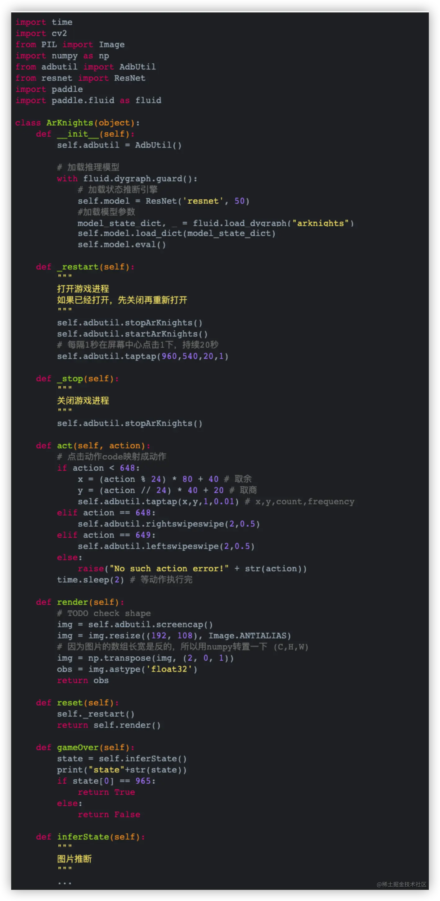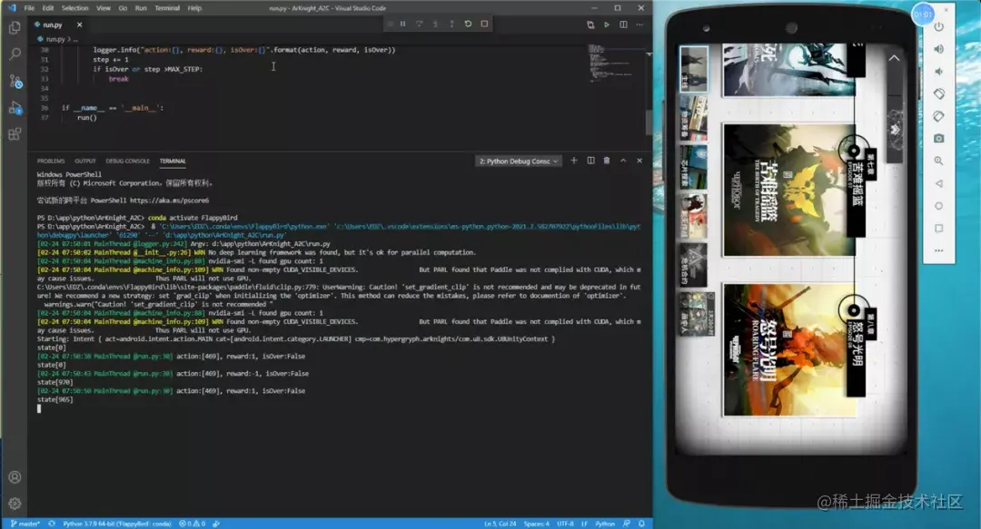 这里的游戏状态推断引擎,就是ARKNIGHT_CLASSIFY项目输出的推理模型。有了状态的推理值,代码中的reward和game over就可以和真机环境匹配上。同时,用AdbUtil类来执行真实动作,就可以操作真机执行算法动作。