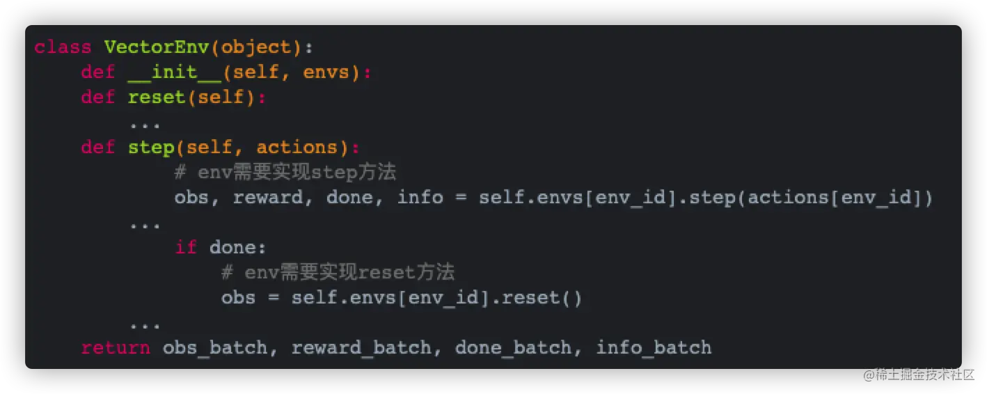 VectorEnv函数 这个类是PARL对env环境的封装。我们的模拟真机环境,也采用了同样的定义,主要是为了同时跑多个环境,增加并行计算的效率,如下所示: