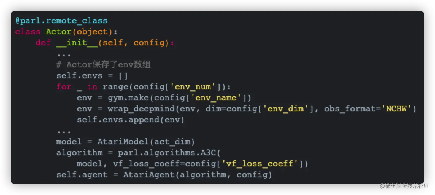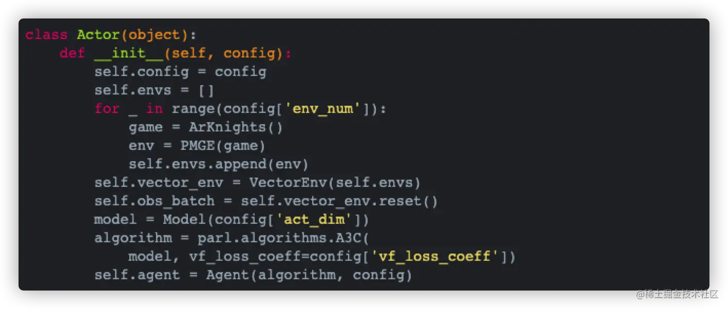 注意,Actor的init方法中保存了env数组,用同样的参数实例化了模型,用同样的模型实例化了算法并作为参数传入到了Agent中。