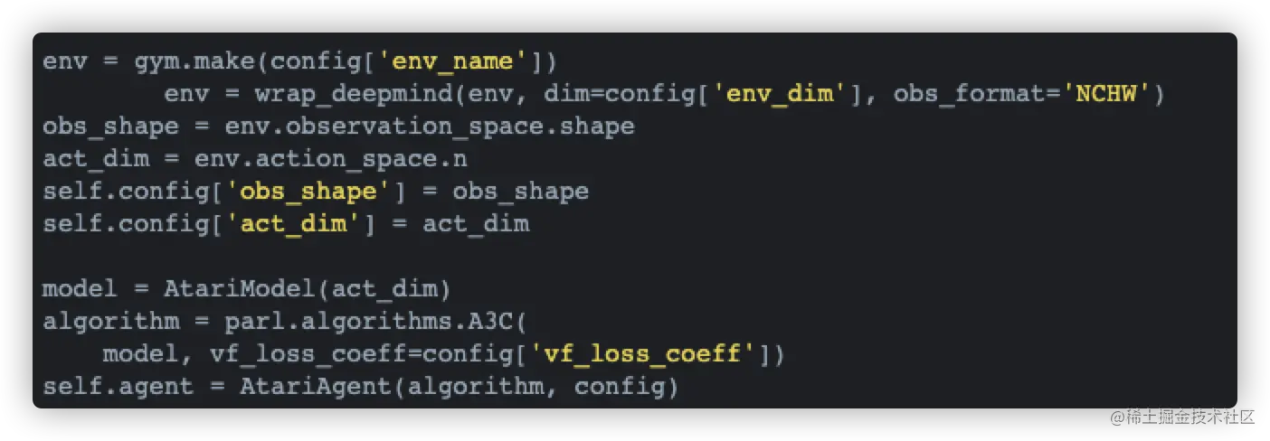 Learner 这个类有意思的地方是,PARL库用了A3C的名字。原因是A2C和A3C是同源算法。它们实现上的主要区别是step函数(后面会讲到)。