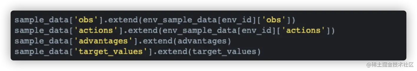 sample函数 Actor中的sample函数会调用Agent的sample函数和Agent的value函数来分别更新本地的π网络和v网络,最终返回sample_data给中心节点。