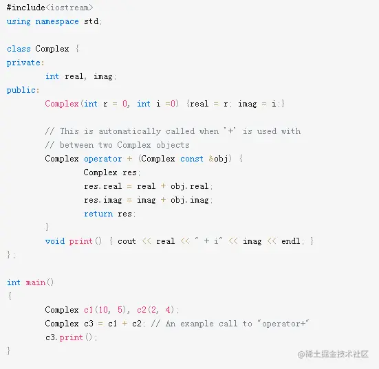 在上面的示例中,运算符“ +”超载。运算符“ +”是加法运算符,可以将两个数字(整数或浮点数)相加,但此处使该运算符执行两个虚数或复数的加法运算。