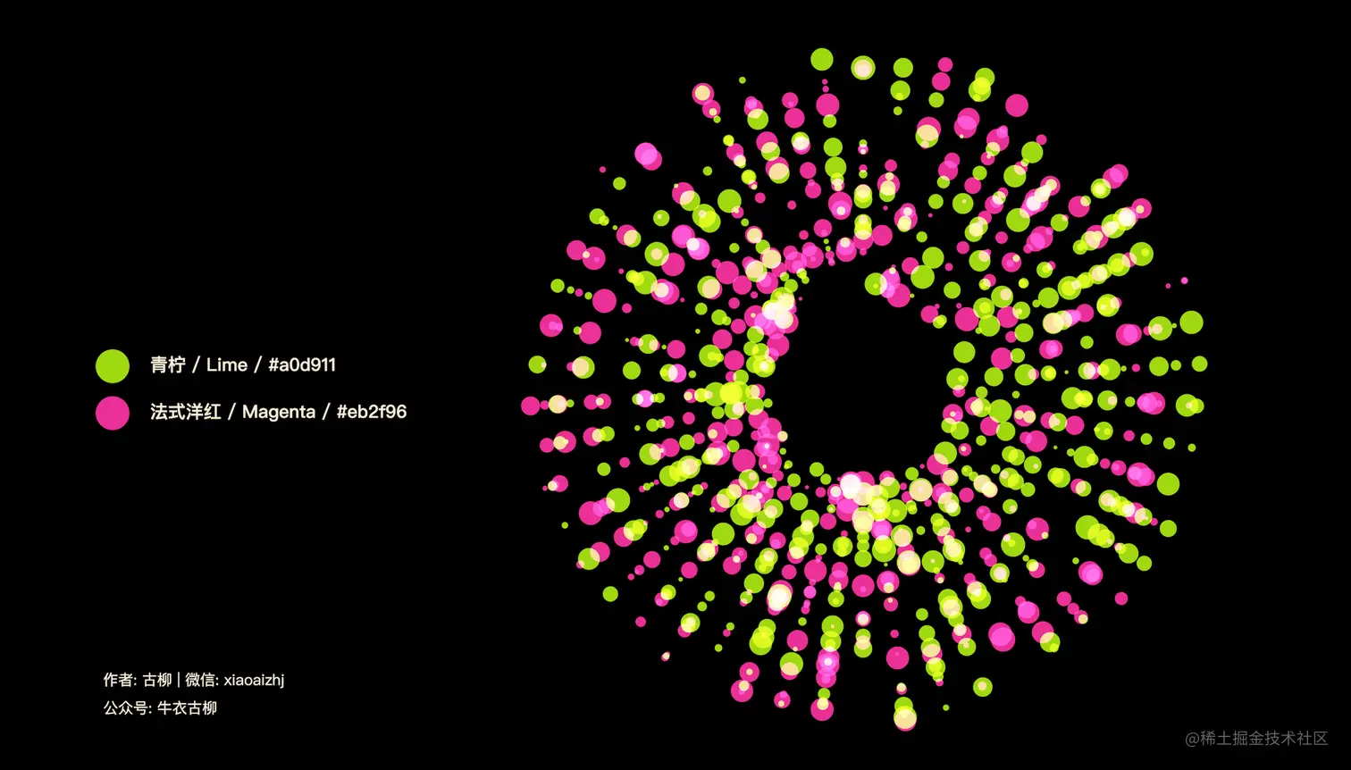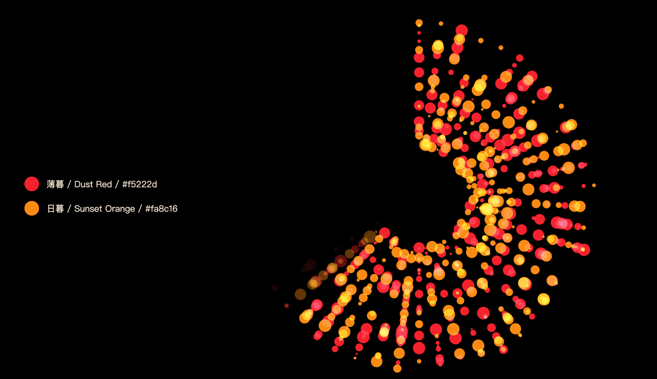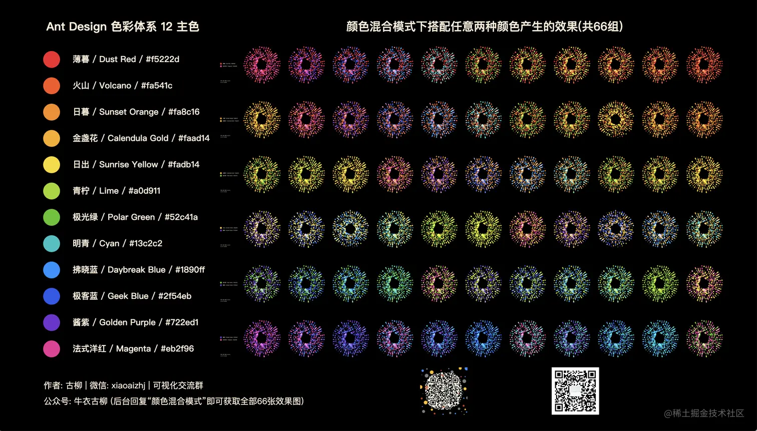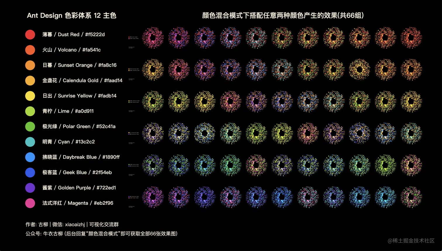 就这样从一开始突然想实践下“颜色混合模式”,看看能不能复现出 MotiveMix 作品的类似光效,到利用 Ant Design 系统级色彩体系的12主色制作所有66组效果图,并顺带制作了一期视频,以方便更多人能直观感受到古柳称之为“视觉盛筵”的这些作品的震撼效果,私心觉得比之前小火的23万播放量的「中国传统颜色可视化」视频还要赞,希望大家也会喜欢。