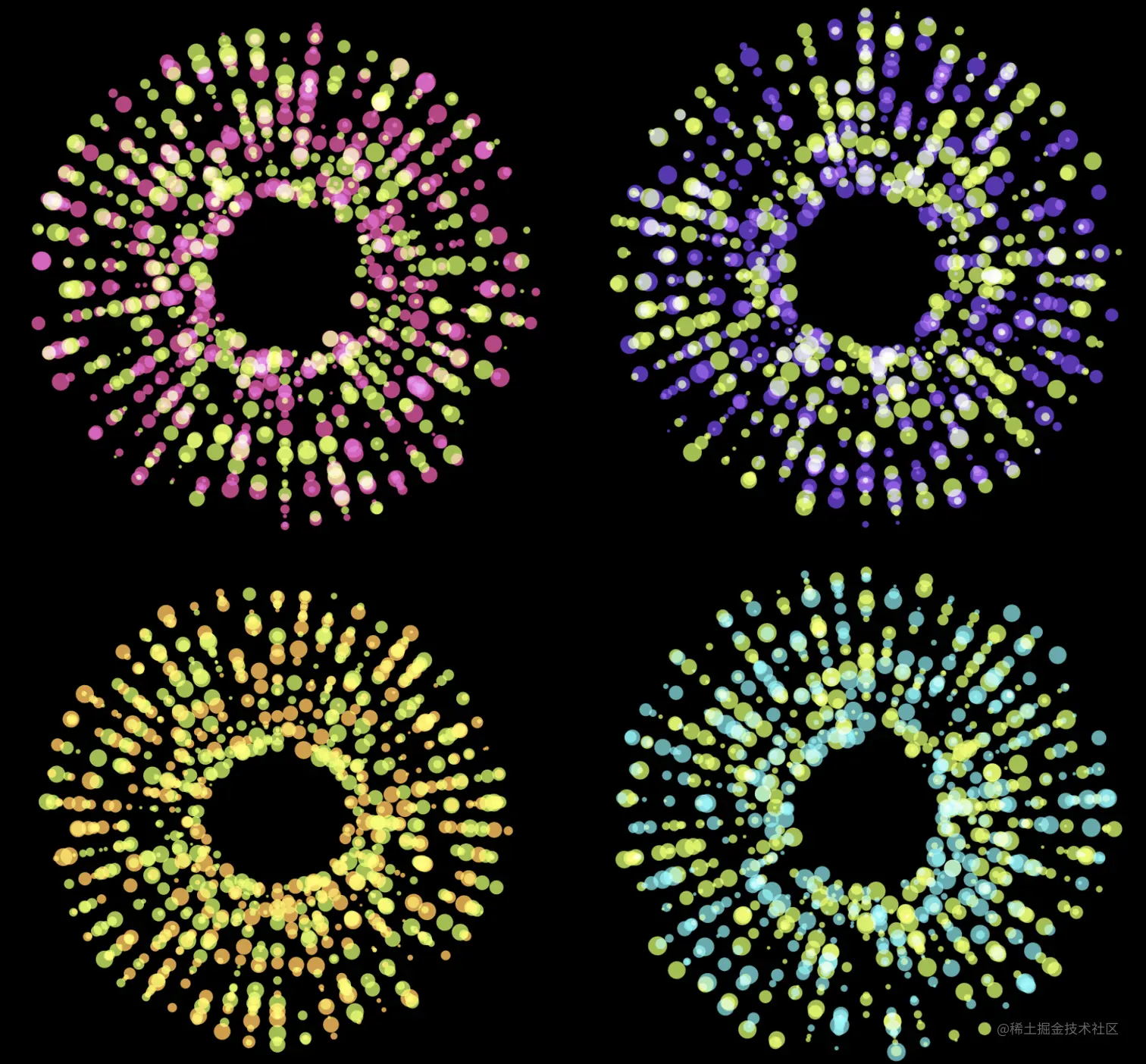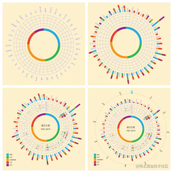 首先是径向图,实现过很多次,但也忘了些细节,看看以前文章里的思路与代码,复制黏贴再改下就行。参见:财新网「星空彩绘诺贝尔奖」可视化作品复现 - 古柳 2020-09-30、关于推特30天地图挑战全部7.6k+图片的颜色可视化 - 古柳 2020-12-12