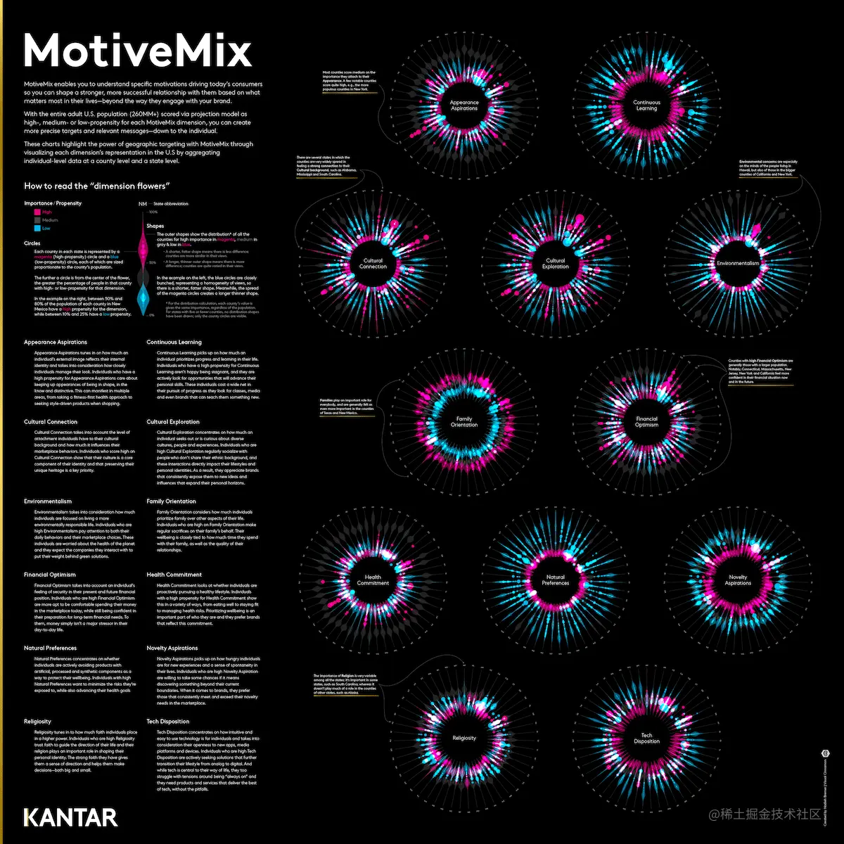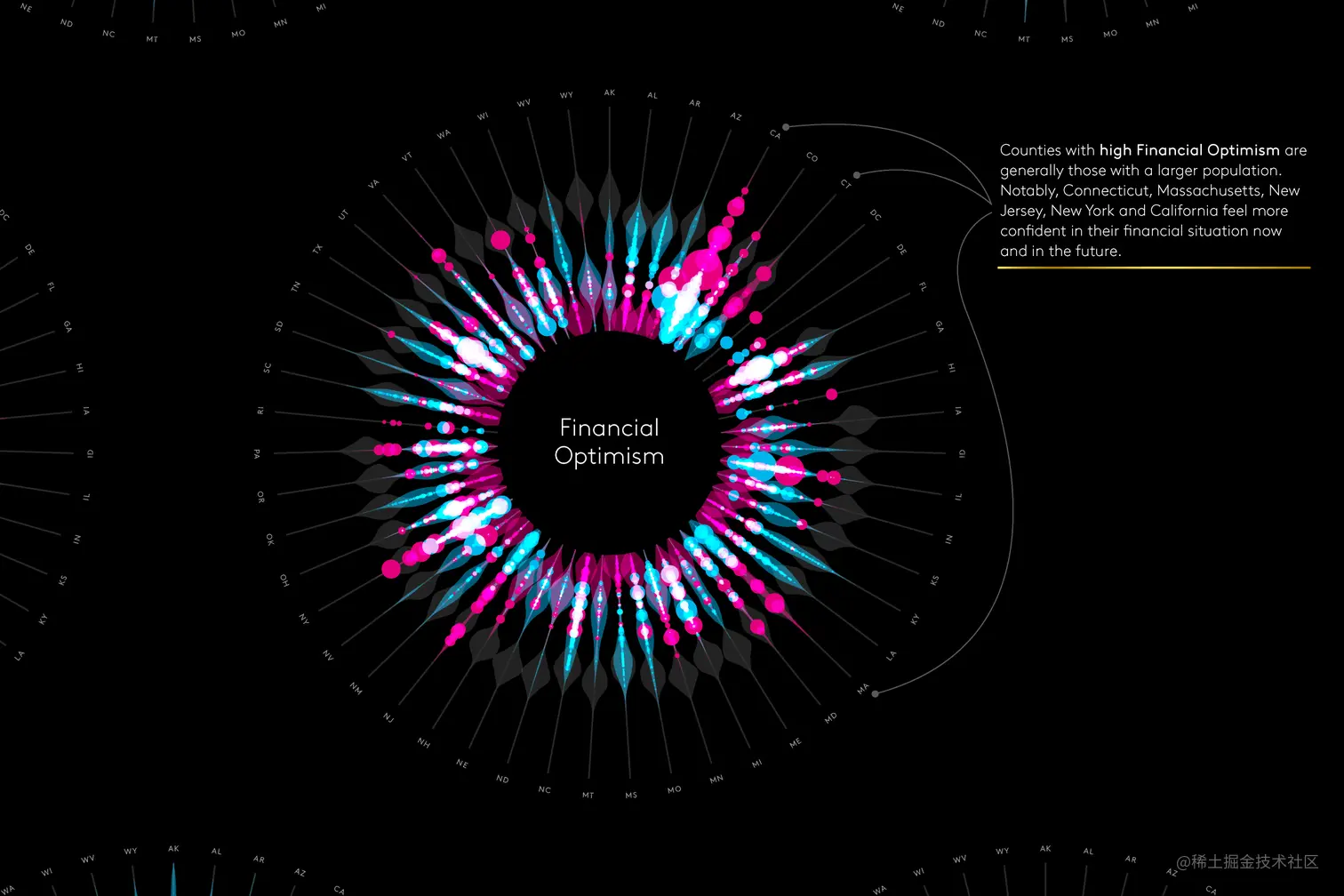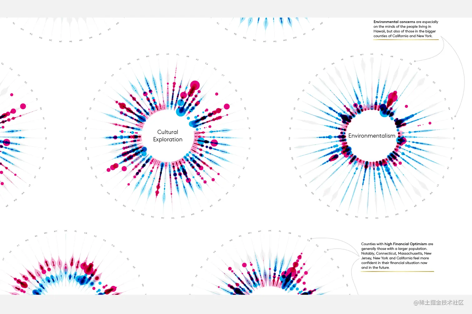 这两天古柳突然想实践下“颜色混合模式”,看看开启这个设置后可视化作品会有什么效果,其实不太记得为什么突然有这个想法,可能是因为在看一些颜色/色彩相关内容时,想起 Nadieh Bremer 为客户 Kantar Consulting 做的可视化作品 MotiveMix,因为“光效”太好看,所以一直铭记于心。