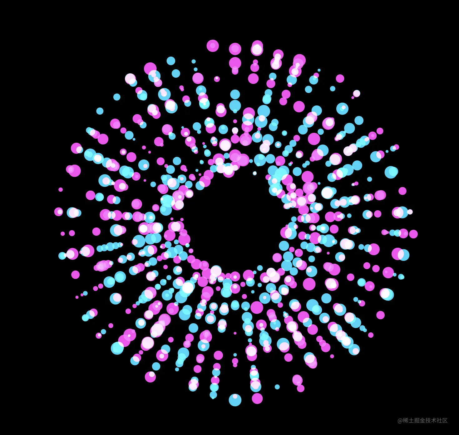 这次具体只需简单设置三处地方即可:给所有圆圈设置 mix-blend-mode: screen 样式、给圆圈的父元素 group 设置 isolation: isolate 样式、以及设置整体背景为黑色 background-color: #000 即可,由于后续会将 SVG 导出成图片,所以设置 SVG 的背景色为黑色,而非 body 等为黑色,以免导出时失去效果。