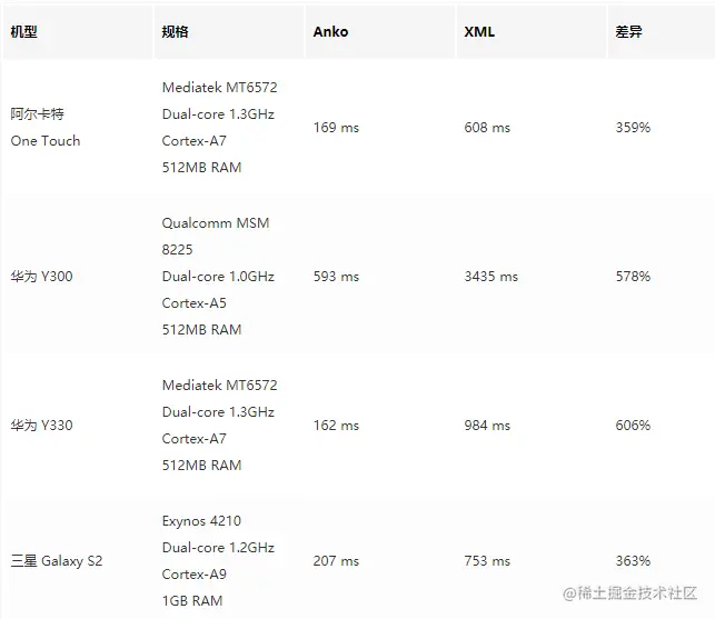 同时,它去除了IO与反射过程,性能更好,以下是Anko与XML的性能对比