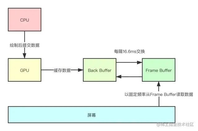 CPU:执行应用层的measure、layout、draw等操作,绘制完成后将数据提交给GPUGPU:进一步处理数据,并将数据缓存起来- 屏幕:由一个个像素点组成,以固定的频率(16.6ms,即1秒60帧)从缓冲区中取出数据来填充像素点