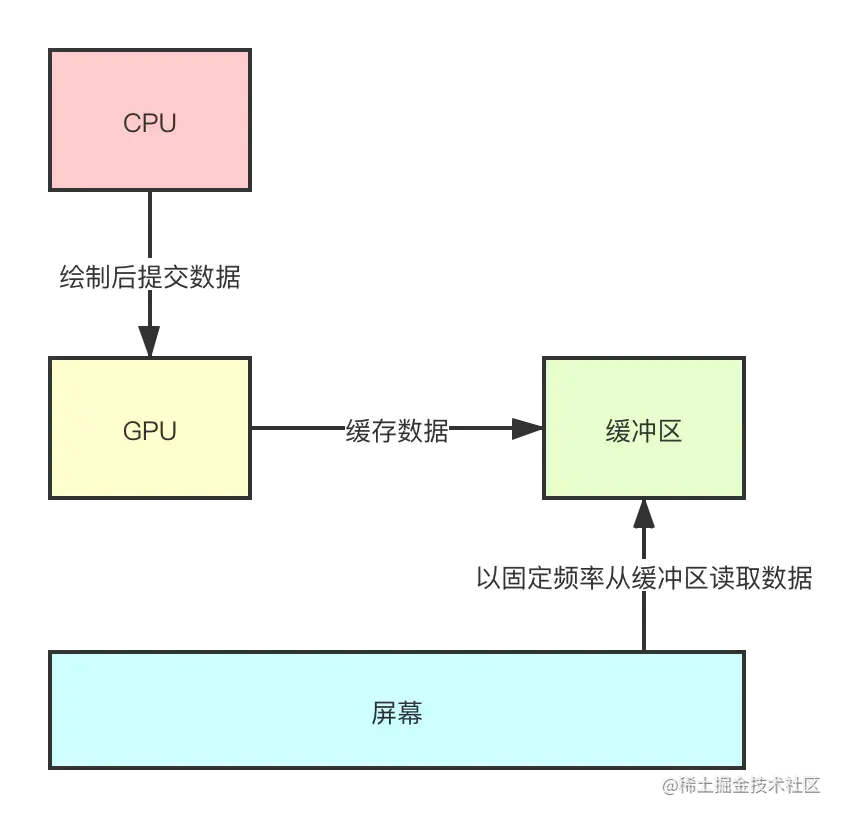 总结一句话就是:CPU 绘制后提交数据、GPU 进一步处理和缓存数据、最后屏幕从缓冲区中读取数据并显示