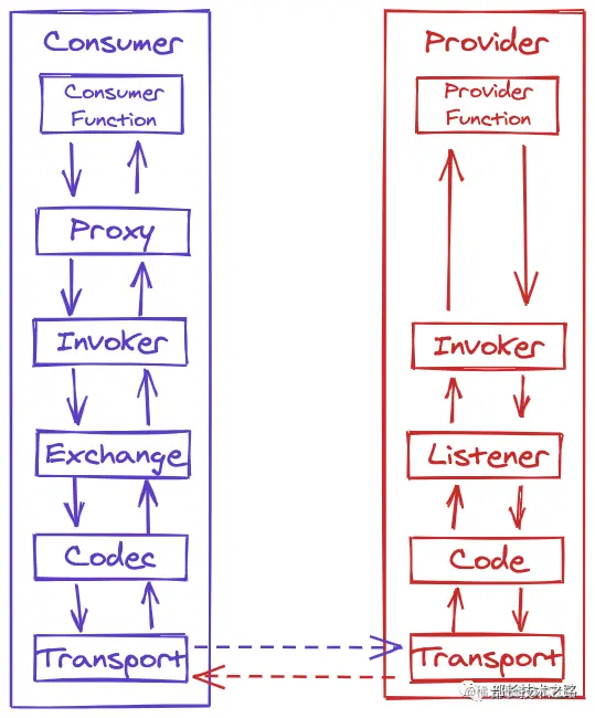 Consumer 至此已将数据序列化完毕,对 Provider 发起网络连接并进行数据传输。数据到达 Provider 后,Provider 会怎么样处理呢?不用急,接下来将继续讲解。