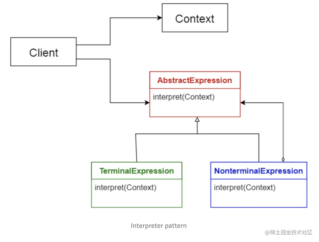 此模式通常用于设计组件来解释使用专用语言写出的程序,它主要指定如何估算程序行,即以特定语言编写的语句或表达式。基本思想是为每种语言符号都设计一个类。