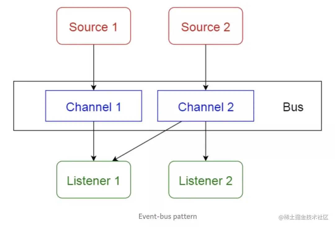 该模式主要处理组件,有4个重要的组件:事件源、事件侦听器、通道和事件总线。事件源将消息发送到事件总线上的特定通道,侦听器会订阅特定的频道。当消息发送到频道中后,订阅该频道的侦听器会收到该消息的通知。