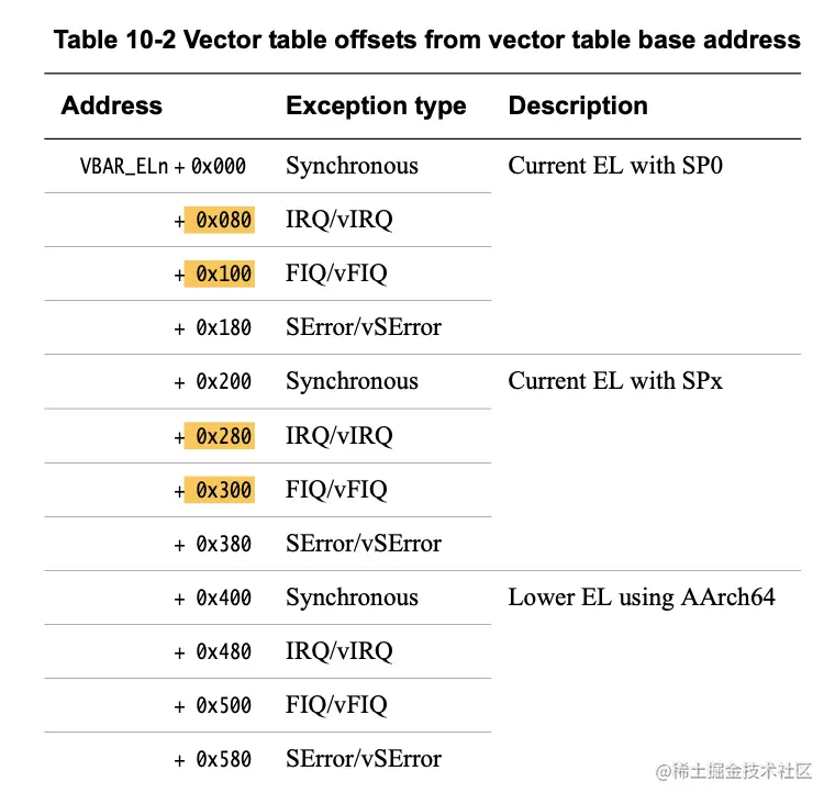 结合上述的异常处理表的注册位置,与ARM官方文档的位置进行对比,可以发现: