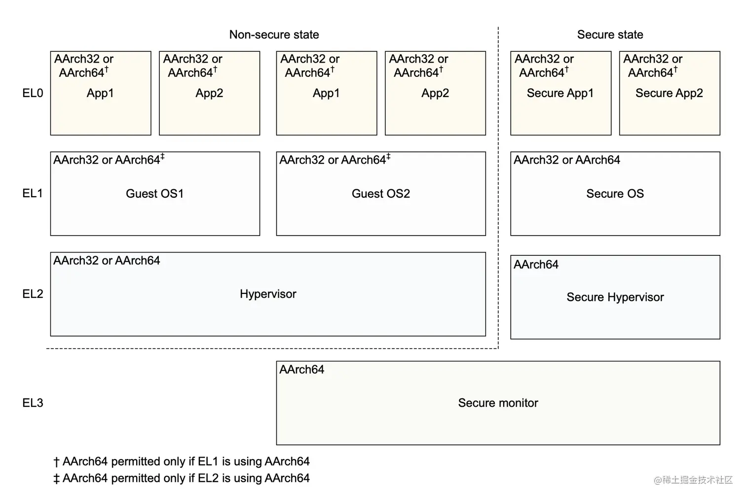 异常系统有很多能力,其中一个重要的能力就是内核态与用户态切换。ARM的执行权限分为4个等级,EL0,EL1,EL2,EL3。其中 EL0 代表用户态,而 EL1 代表内核态,当用户态想要切换至内核态的时候,必须通过异常系统进行切换,而且异常系统只能向同等或更高等级权限进行切换。