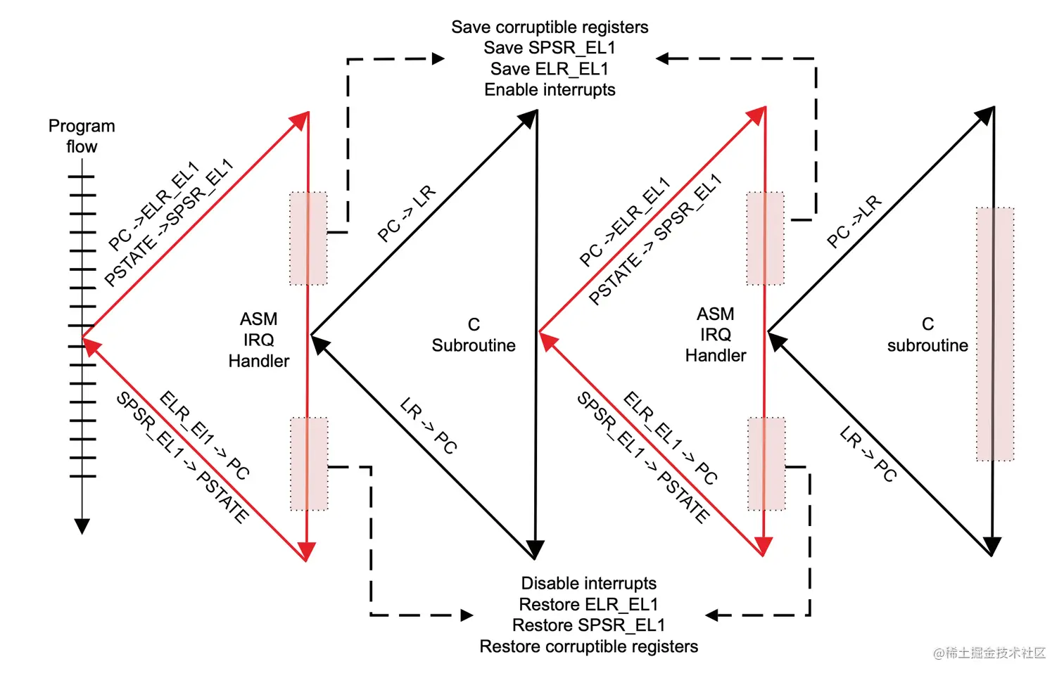 从触发时机上可以区分为同步异常与异步异常。这里指的同步异步并不是应用程序的概念,这里同步指的是拥有明确的触发时机,比如系统调用,缺页中断等,都会发生在明确的时机,而异步中断,则完全无视指令的逻辑,会强行打断指令执行,比如 FIQ 和 IRQ,这里比较典型的是定时器中断。