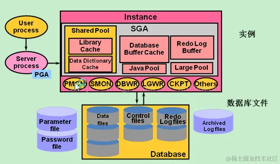 数据库是由一组文件组成的,对数据库的所有操作都是需要通过实例来完成了。通常数据库和实例是一一对应的。例外就是RAC了,RAC下一个数据库就对应了多个实例。