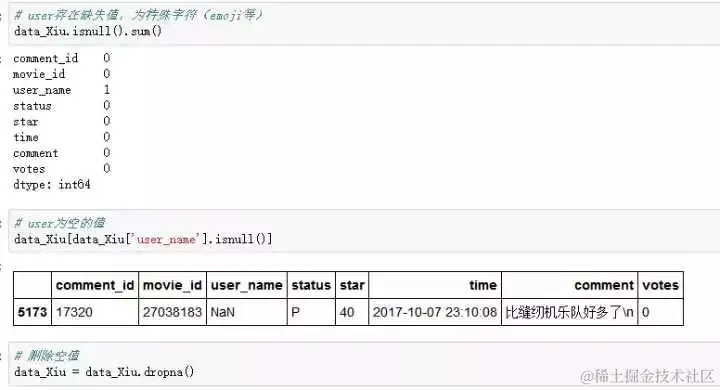 数据还是非常干净的,只有"user_name"有一个缺失值,可能是这名用户的用户名含有什么emoji之类的特殊字符吧~对于缺失值的处理,我们一般可以采取以下方式1、删除缺失值