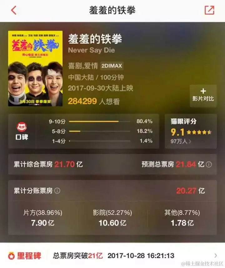 前段时间上映的《羞羞的铁拳》可谓是票房大丰收啊,截止到我写这篇文章时,我看了眼猫眼的数据,票房已经21.7亿了。这也使它成为继《战狼2》、《美人鱼》和《捉妖记》后第四部票房过 20 亿的国产电影,在国内票房史上排第6位啊啊啊~