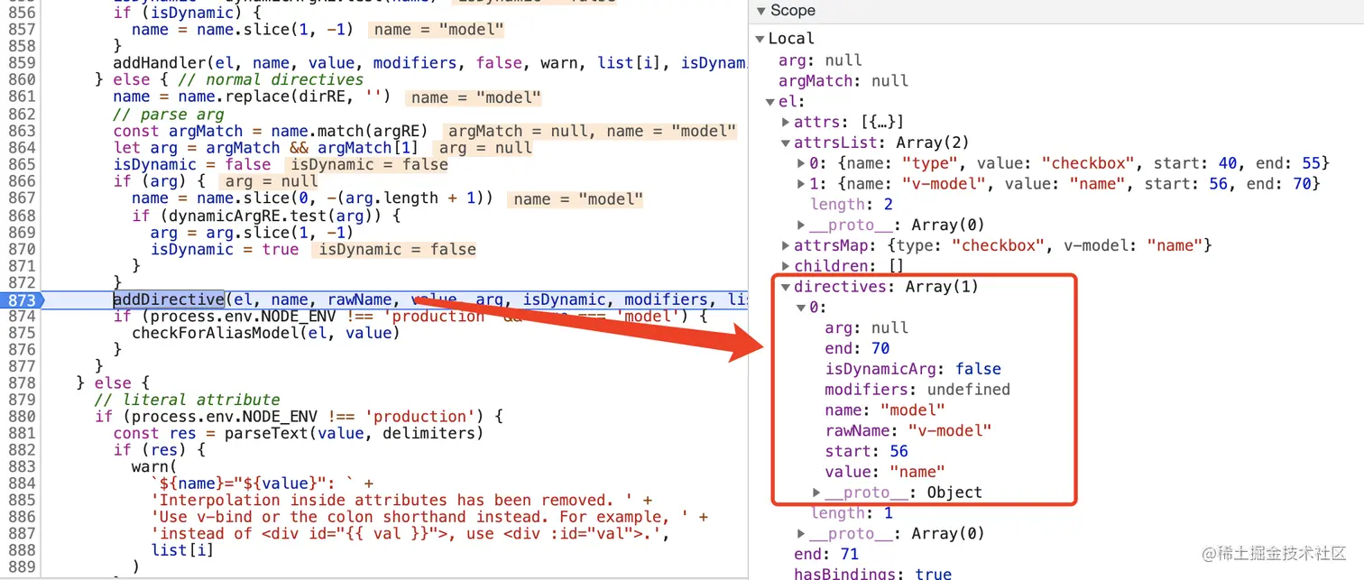 (this._init() => Vue.$mount => compileToFunctions) =>const ast = parse(template.trim(), options)生成ast抽象语法树 => processAttrs方法 => 除去v-bind和v-on之外,使用addDirective =>普通指令会在对应的AST树上添加directives属性
