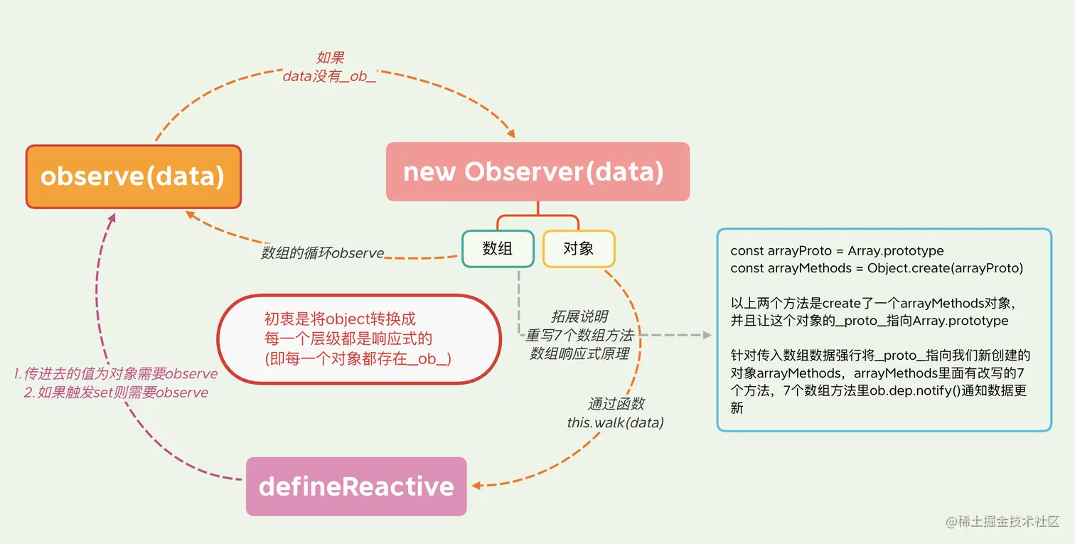 Observer类:如果传入value是一个对象,所以设置完相关变量直接走this.walk(value)方法,循环遍历之后defineReactive(obj, keys[i])。拓展若是数组,则先该value的__proto__属性设置为Object.create(Array.prototype)。接着this.observeArray(value),目的是为了让数组里面的对象也实现响应式