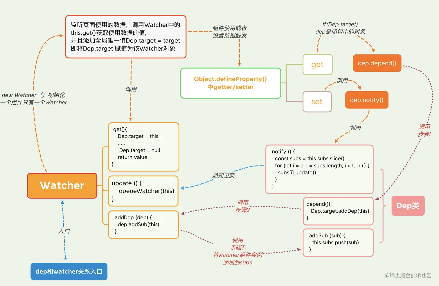 当读取到data中的数据的时候,会触发Object.defineProperty()中的get方法,实现在拿到数据之前的数据劫持。get中主要是进行依赖收集dep.depend(),将正在使用该数据的组件进行收集,该组件我们也称为观察者。如果是修改数据,则触发set方法通知更新dep.notify()