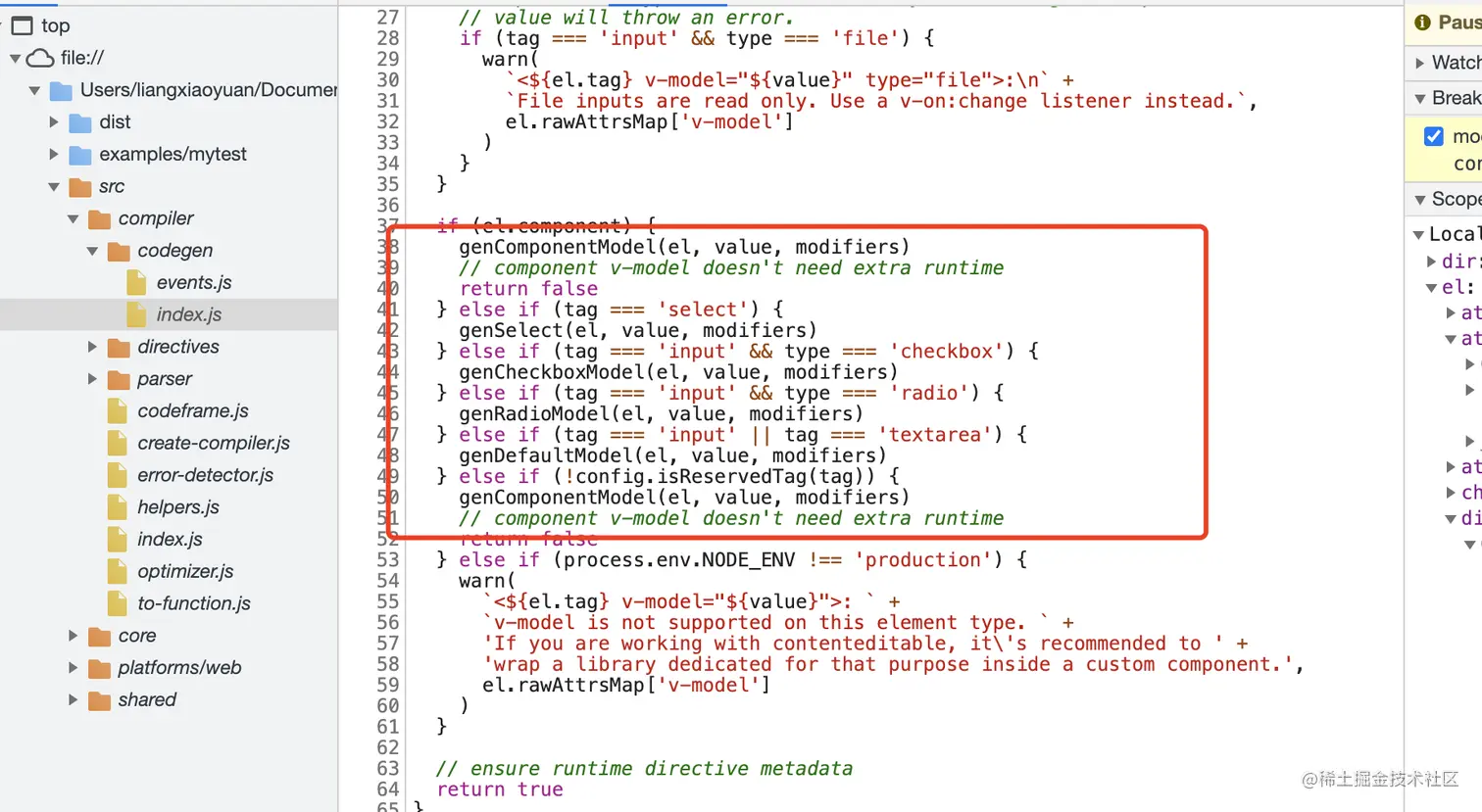 表单控件的v-model处理主要是在model方法中:src/platforms/web/compiler/directives/model.js