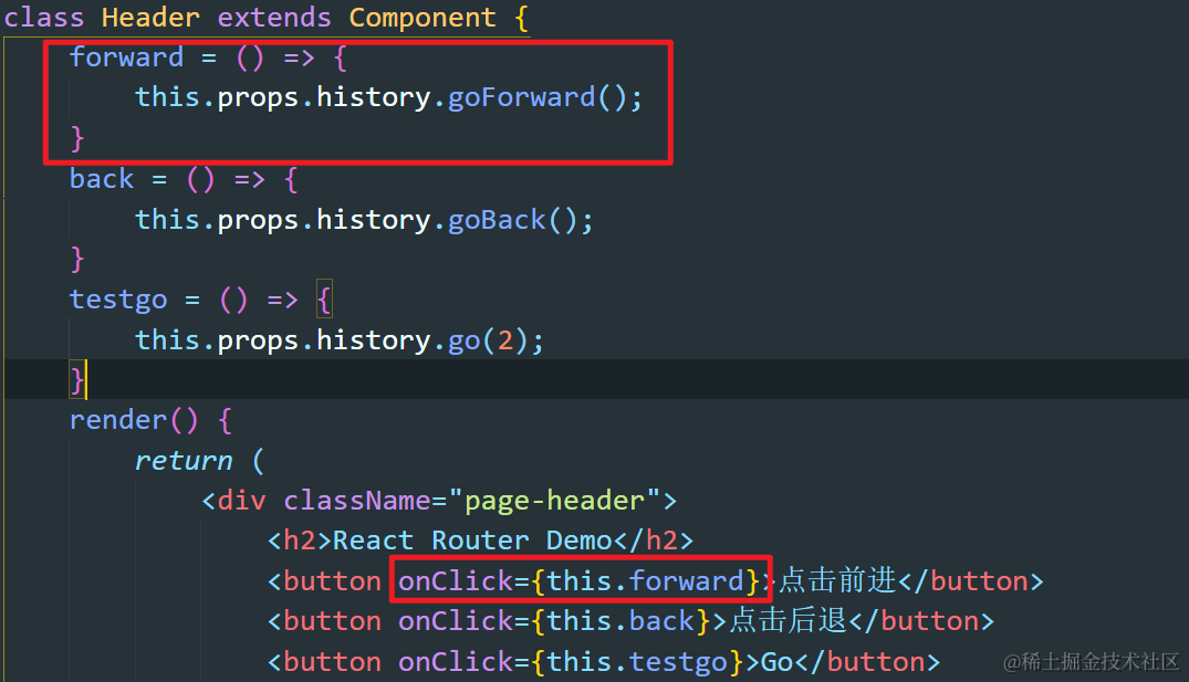 React-37:withRouter的使用 Always_positive 2021-04-14 174 阅读1分钟 使用场景 使得一般组件能够像路由组件一样使用history等路由组件才具有的API 第一步:引入 在一般组件中引入withRouter 第二步:布置函数 第三步:暴露封装好的组件