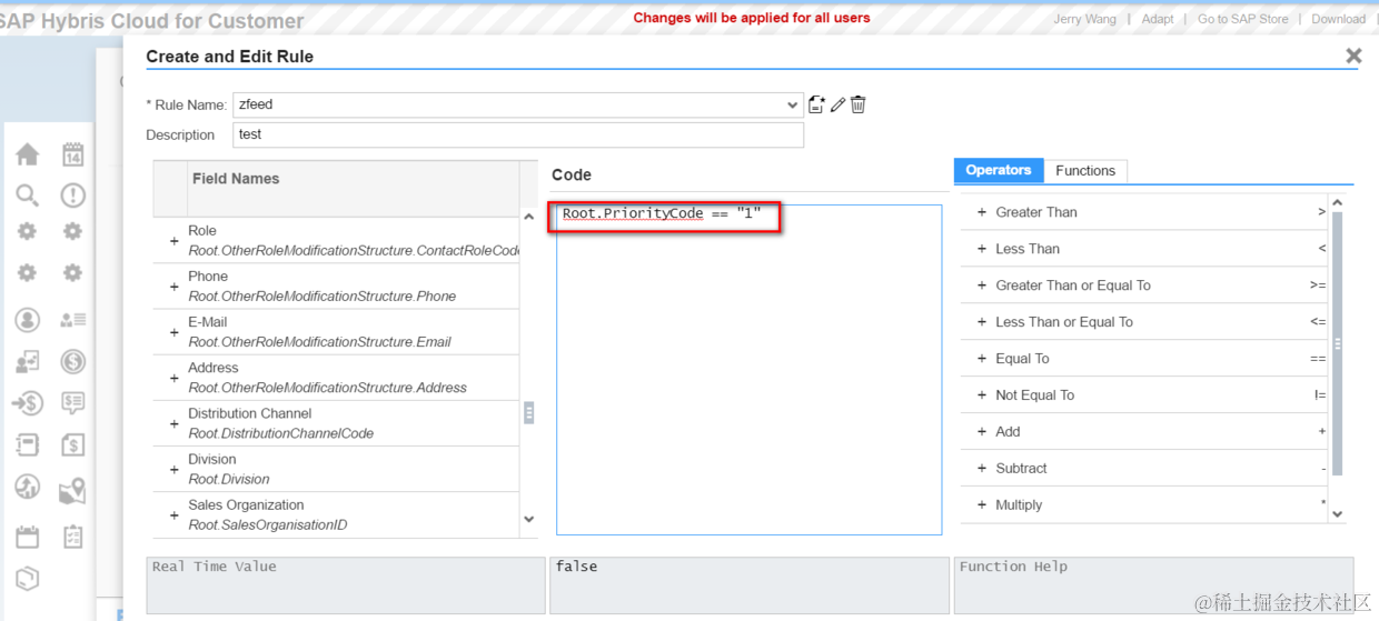 C4C UI上UI元素的显示和隐藏可以通过Key User在Adaptation模式里通过编辑一些简单的rule去控制,诸如这种格式: