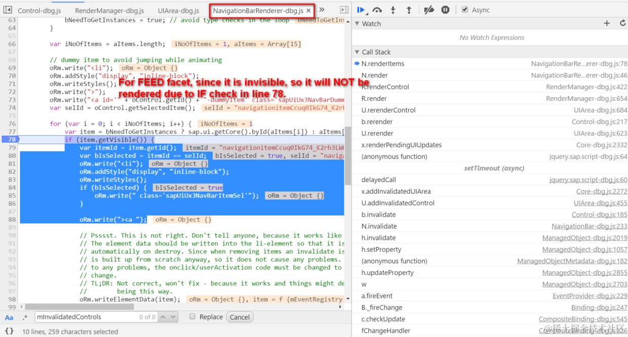 用一句话概括:在rule里将某个UI元素设为隐藏之后,UI5对应的渲染程序就会直接将其忽略——不会进入下图第78行的IF渲染分支里。