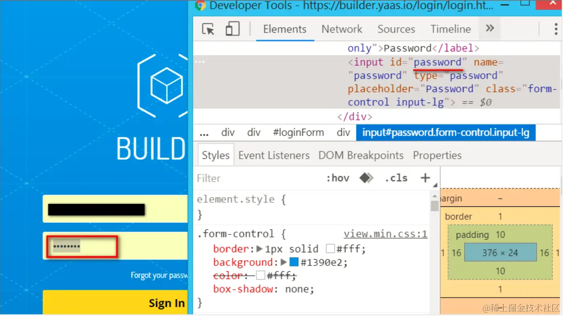 在Chrome开发者工具里点击Elements标签,然后点击网页上的密码元素,该元素的实现的html代码就显示在标签页里了。这里我们能看出该元素的id为password。