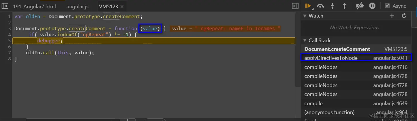 (2) 将浏览器原生的方法实现保存在变量oldFn里,然后重写createComment。在重写的版本里,加上我自己的判断逻辑:我期望只有当创建的comment文本包含ngRepeat时,断点才触发。实现如下图所示。在console里执行下图代码,完成对createComment原始实现的覆盖。