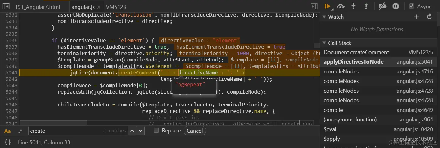 我很好奇Angular框架是在哪行代码生成的这三个注释元素。按照推理,这些注释肯定是通过原生方法createComment创建的,然而我无法在这个方法里面设置断点。如果直接在Angular框架里根据源代码createComment搜索,然后在所有的搜索结果处设置断点——这种方法理论上可行,然而效率太低,因为搜索结果有将近100处调用了createComment。