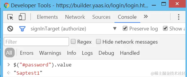 再回到Console标签,输入$("#password").value, 即可显示出密码。