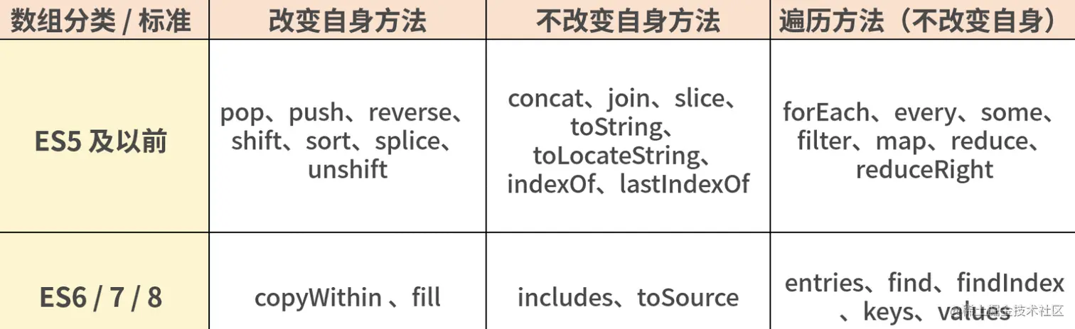 基于 ES7,不会改变自身的方法也有 9 个,分别为 concat、join、slice、toString、toLocaleString、indexOf、lastIndexOf、未形成标准的 toSource,以及 ES7 新增的方法 includes。