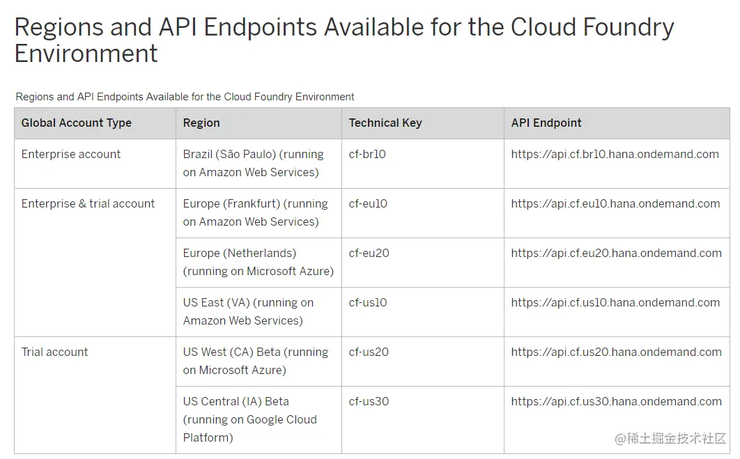 从下图能发现,Cloud Foundry的运行环境,基础设施由第三方公司提供,比如Amazon亚马逊和Microsoft微软,SAP只负责提供和维护platform layer。而Neo环境的基础设施和platform layer均由SAP提供。