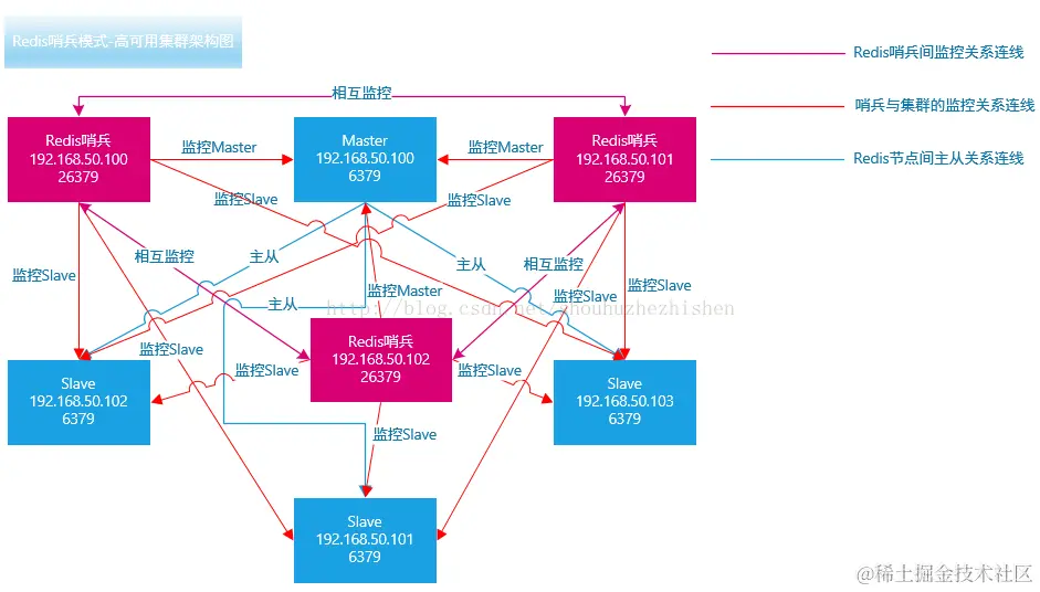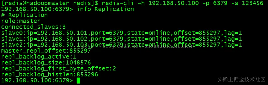 现在192.168.50.100:6379是master,192.168.50.101:6379、192.168.50.102:6379和192.168.50.103:6379是salve。