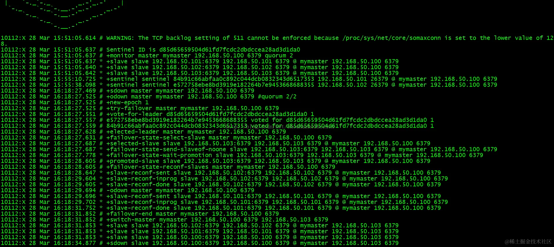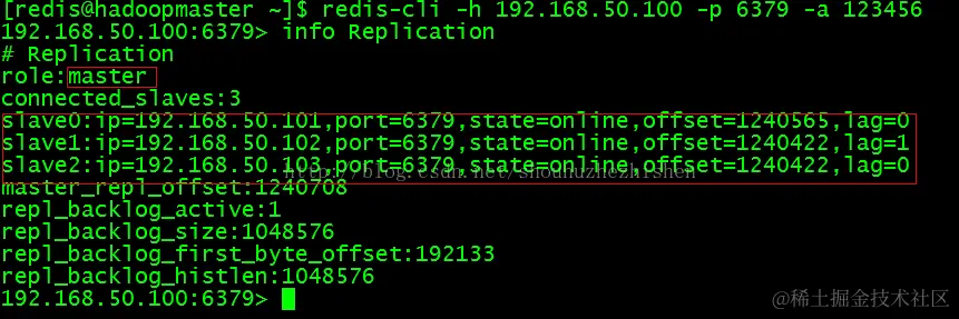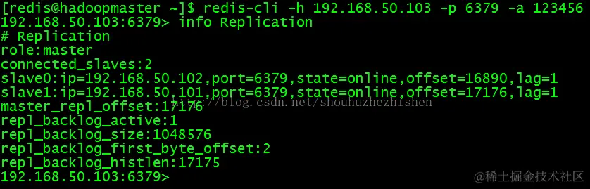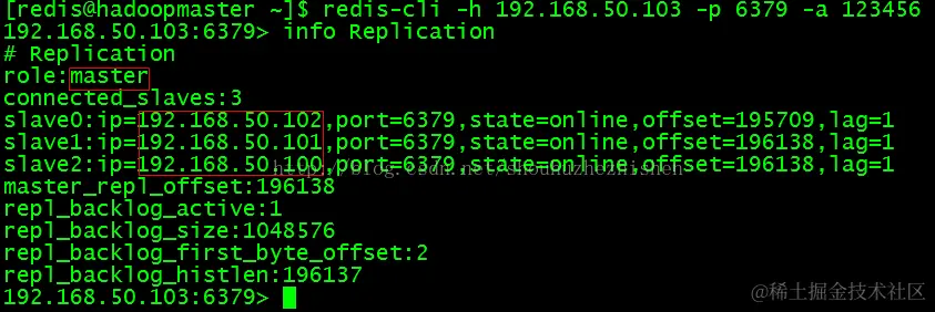 现在192.168.50.103:6379是master,192.168.50.100:6379、192.168.50.101:6379和192.168.50.102:6379是salve。
