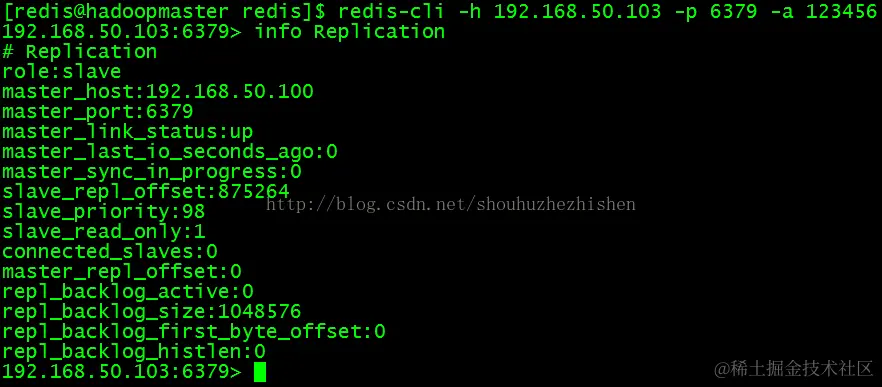 4.5、登录Slave(192.168.50.103)的redis查看Slave的情况: