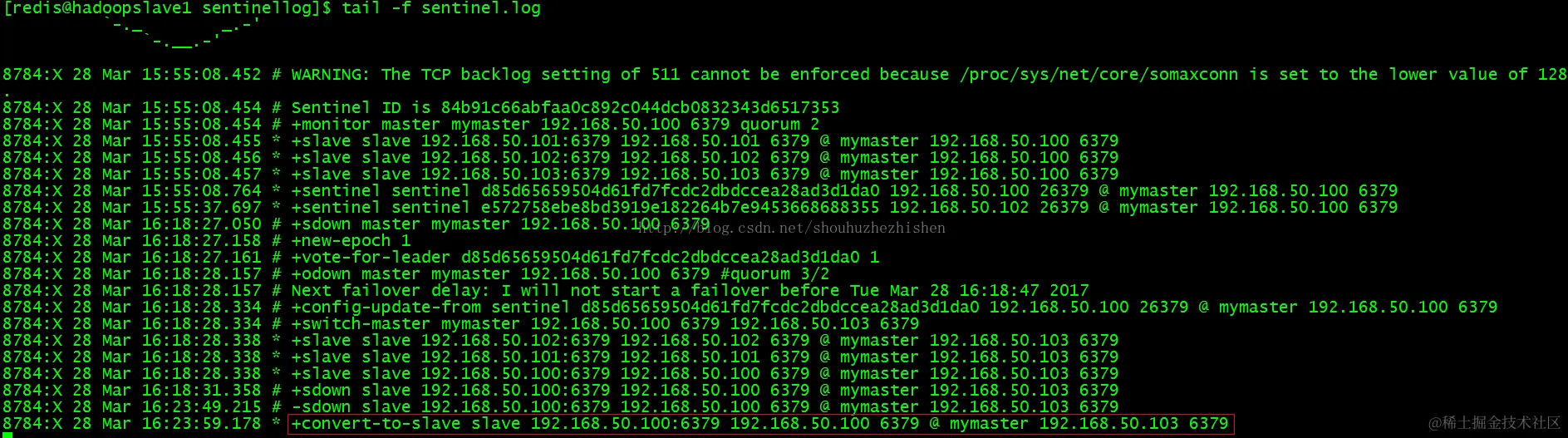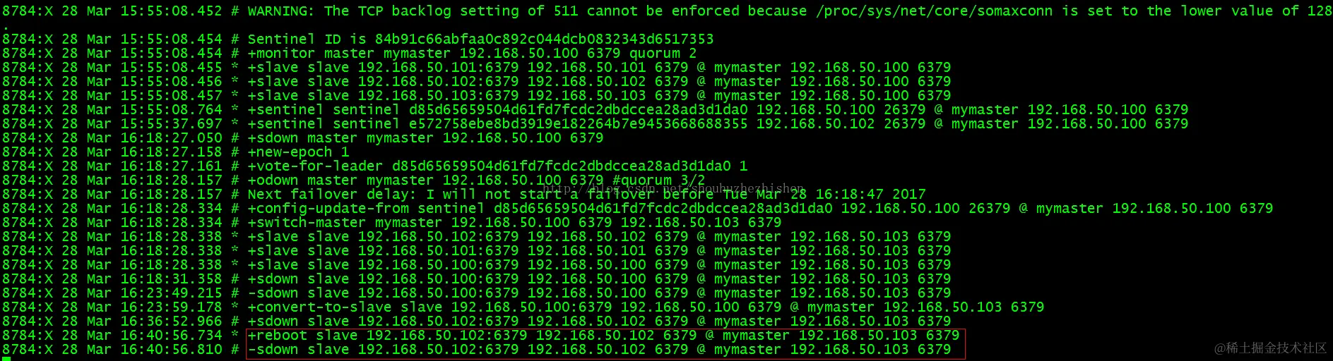 关闭Slave(192.168.50.102)后查看Sentinel日志信息: