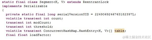 从上图可以看出,很重要的一个是table变量。是一个HashEntry的数组。Segment就是把数据存放在这个数组中的。除了这个量,还有诸如loadfactor、modcount等变量。