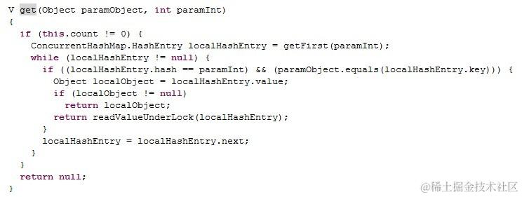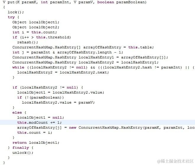 在segment的get函数中,通过getFirst函数得到第一个值,然后就是通过这个值的next,一路找到想要的那个对象。如果不空,则返回。如果为空,则可能是其他线程正在修改节点。比如上面说的弱一致迭代器在将指针更改为新值的过程。而之前的 get操作都未进行锁定,根据bernstein条件,读后写或写后读都会引起数据的不一致,所以这里要对这个e重新上锁再读一遍,以保证得到的是正确值。readValueUnderLock中就是用了lock()进行加锁。