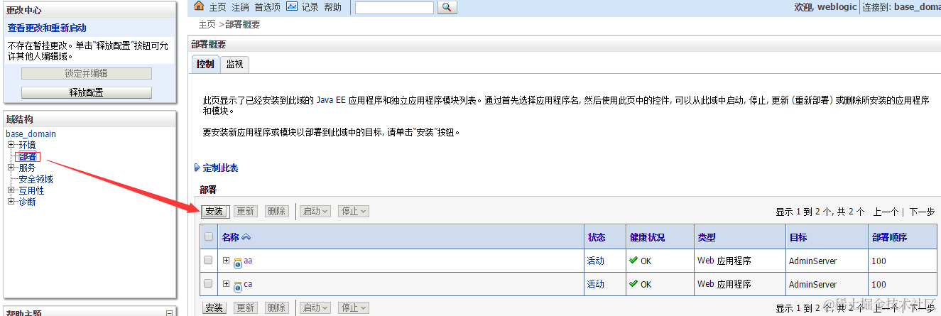 2、选择部署,进一步点击右边的安装