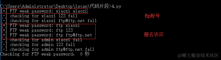 print 'Checking for FTP weak password: %d 秒' % (time.time() - start_time)