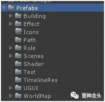 这个目录是真正项目要用到的各种预制体文件,比如一个士兵,拿到Fbx之后,由工具生成特定的Prefab到指定目录,这里包含了各种资源,也是通过子目录来划分类别。这部分由客户端和各种工具共同维护。