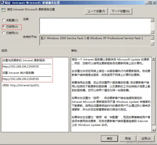 4、在【指定Intranet Microsoft更新服务位置】选项区中选中【已启用】 单选按钮,同时在【设置检测更新的Intranet更新服务】和【设置Intranet统计服务器】文本框 中输入IP地址,单击【确定】按钮。
